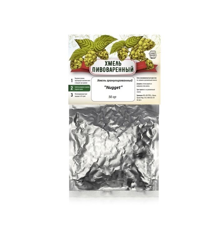 Хмель гранулированный Nugget в удобной вакуумной упаковке 50 грамм – хмель с резкой классической горечью, выращиваемый в США с 1982 года и являющийся старшим братом популярного американского хмеля Миллениум. Данный сорт хмеля занимает около 15% рынка хмеля в США. С использованием хмеля Наггет изготавливают очень многие сорта пива, но в основном он используется в имперских элях. Добавлять хмель в пивное сусло стоит «по щепотке»: на 10 литров пивного сусла следует добавлять не более 20 грамм хмеля. Это конечно зависит от вкусовых предпочтений каждого пивовара, но именно хмель придает горечь и характерный аромат пиву.