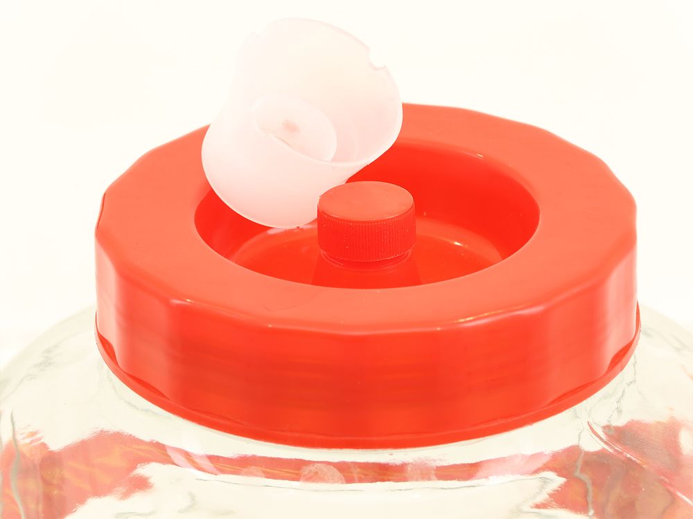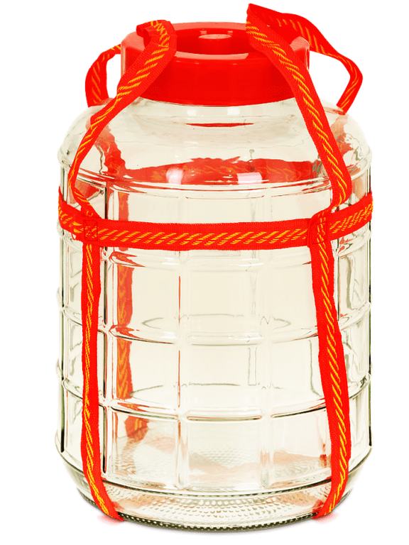 Бутыль стеклянная объёмом 26 литров. Толстое стекло, широкое горлышко, винтовая крышка со встроенным гидрозатвором. Имеет текстильные ручки для переноски.