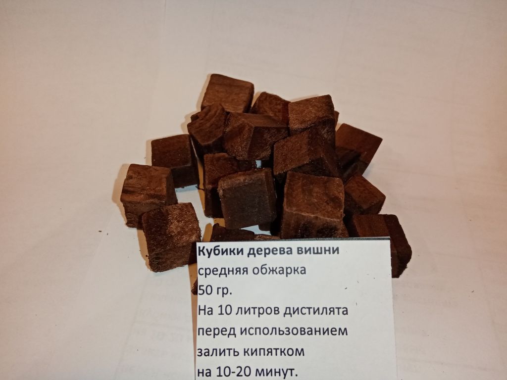 Кубики из древесины вишни. Средняя прожарка. Добавят неповторимую ароматику ягодного дерева. Для цвета добавьте немного дубовых кубиков сильной или средней прожарки. Упаковка 50 гр. рассчитана до 10 литров дистиллята. Перед использованием рекомендуется залить 2-3 раза крутым кипятком и дать постоять 10-5 минут. Настаивать не более 2-3х месяцев.