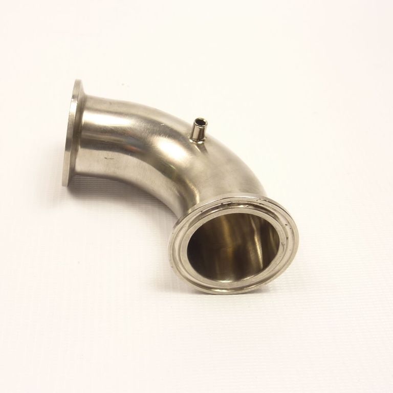 Отвод кламп (CLAMP) - это зажимная деталь трубопровода в виде изогнутого отрезка трубы под 90 градусов, с приваренными зажимными патрубками (штуцерами CLAMP) по концам. Отвод оснащен штуцером для установки электронного термометра.