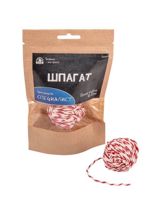 Шпагат колбасный хлопчатобумажный, используется для вязки колбас, подвешивания мясных и рыбных изделий в процессе копчения, вяления. Перед применением шпагат окунают в воду на 1-3 мин. для увеличения его прочности.