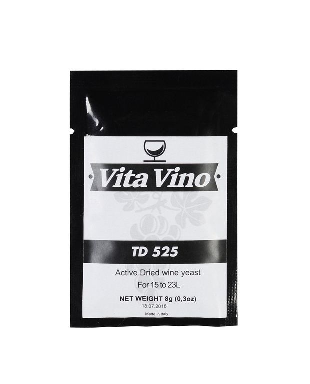 Сухие винные дрожжи Vita Vino TD-525 предназначены для приготовления крепких вин из винограда и ягод. Дрожжи выведены на винных заводах в Италии и прекрасно сбалансированы, что делает их универсальными для всех видов сырья. Подходят для домашнего виноделия. Штамм раскрывает вкус винограда и ягод, не добавляя в него «бражного вкуса». Дрожжи выбраживают вино до 21 градуса – рекордсмен среди винных дрожжей.