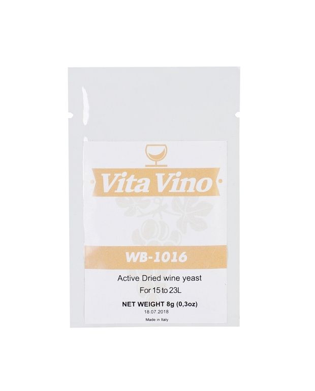 Сухие винные дрожжи Vita Vino WB-1016 предназначены для приготовления белых вин из винограда и ягод. Дрожжи выведены на винных заводах в Италии и прекрасно сбалансированы, что делает их универсальными для всех видов сырья. Подходят для домашнего виноделия. Штамм раскрывает вкус винограда и ягод, не добавляя в него «бражного вкуса». Вкус вина получается с выраженным ароматом исходного сырья. Дрожжи выбраживают вино до 16 градусов.
