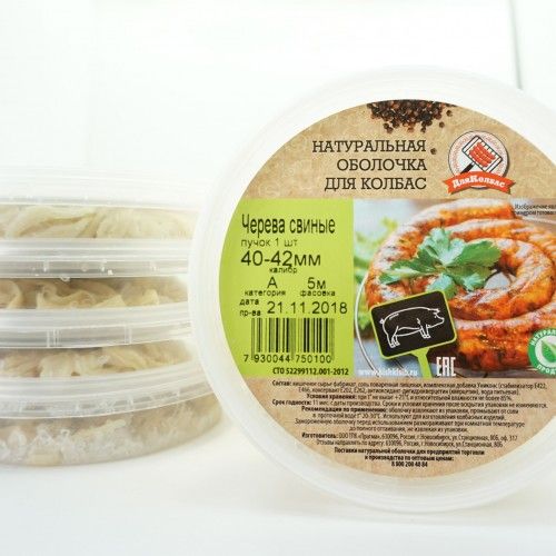 Черева (кишки) свиные, диаметром 40-42 мм хорошо подходят для изготовления любых видов колбас, как варёных так копчёных. Длина в упаковке 5 метров. Благодаря механическому способу очистки, черева идеально чистые. Метод сухого посола. При подготовке для набивки колбасы необходимо лишь промыть черева от посолочной смеси. При необходимости, можно отрезать необходимое количество черевы, а остальное оставить в надёжном ПЭТ контейнере и хранить в холодильнике/морозильнике.