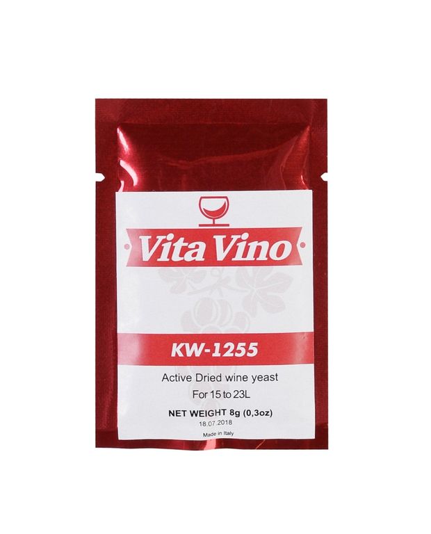 Сухие винные дрожжи Vita Vino KW-1255 предназначены для красных вин из винограда и ягод. Структура дрожжей сбалансирована с помощью подкормки, выведенной в Италии. Подходит для домашнего виноделия. Штамм раскрывает вкус винограда и ягод, не добавляя в него «бражного вкуса». Дрожжи Vita Vino KW-1255 выбраживают вино до 16 градусов. Прекрасно работают с декстрозой/сахаром из-за специальных аминокислот в составе дрожжей. Обращаем внимание на то, что для внесения дрожжей в сок или подготовленный жмых, их не нужно регидрировать. Необходимо просто посыпать дрожжи и перемешать в емкости для брожения. Не образуют пены, что важно для приготовления качественного и вкусного домашнего вина.